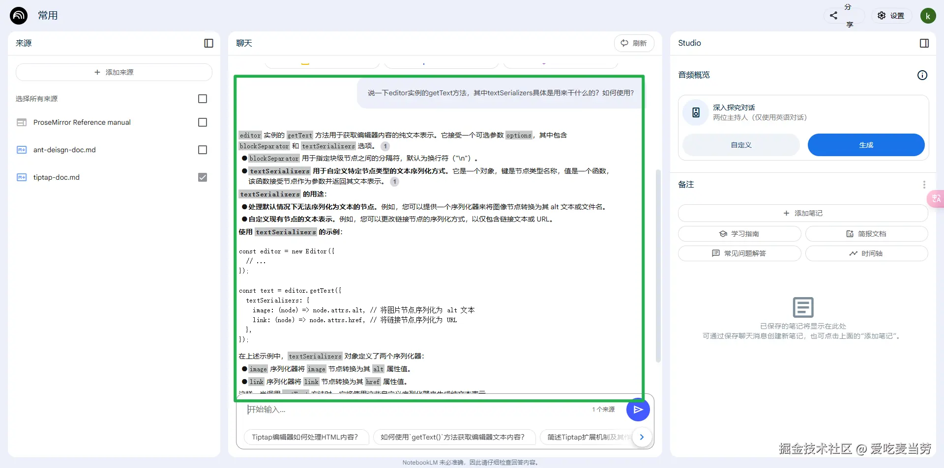 另外,notebookLM所带的模型能力,也可以根据你所附带的source,对文档的内容进行解释。这里我们以tiptap的官方文档为例,现在我想了解实例的getText方法的textSerializers参数,见下图的官方文档对于,方法的描述简略,对于不熟悉框架的用户来说其实很不方便