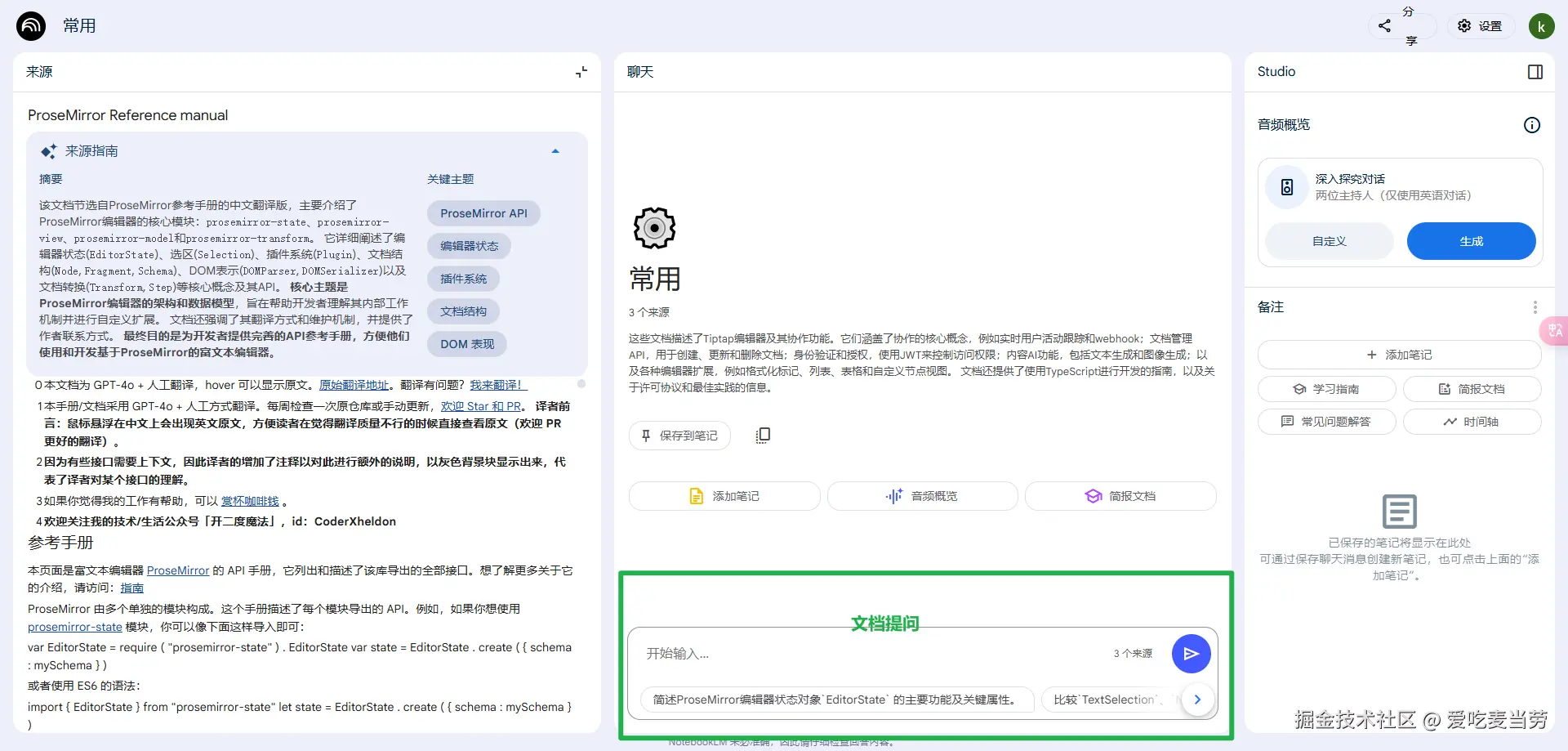 还是以tiptap为例子,它是一个用ProseMirror实现的富文本编辑器。tiptap的官方文档中,对于内部的一些底层的方法,数据结构解释的十分模糊。这对于我们的学习形成很大的阻碍,此时利用notebookLM进行联合提问,或许是一个不错的选择