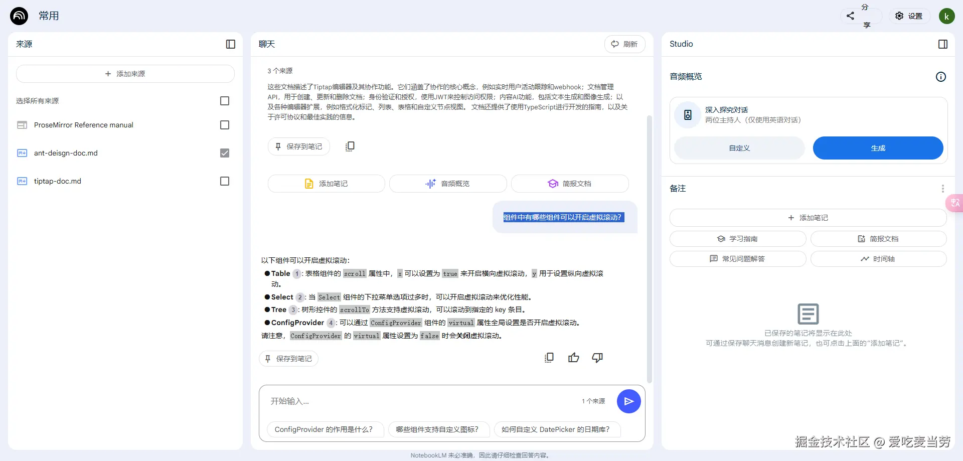 - notebookLM本身也有大模型的能力,所以可能会胡诌。我们对于提问的结果不要全然尽信,还是应该参考官方文档的描述