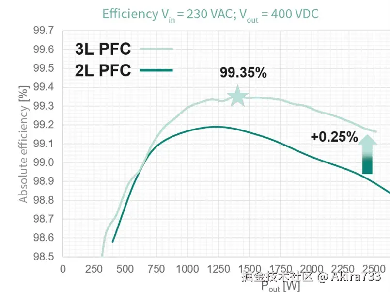 使用 CoolSiC™ MOSFET 400V的三电平级飞跨电容图腾柱PFC(3-L FCTP PFC)不仅能够实现更高的交流输入电压(见第2.2节),且相较CoolSiC™ 650V和750V参考器件,其品质因数(FoM)更佳,因此还能提供显著的功率密度和效率优势。经过优化的电感器设计(包括尺寸、材料和绕组)和3L拓扑结构中的RDS(on)选择,结合更低的开关损耗,能够实现平缓的效率曲线:峰值效率超过99.3%,满载效率超过99.15% (见图8)。