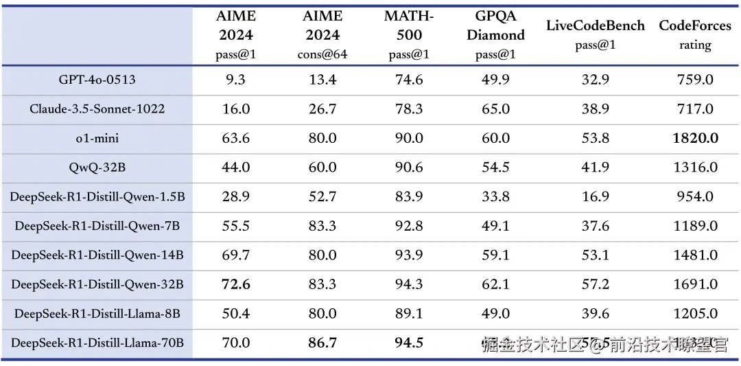 我们在开源 DeepSeek-R1-Zero 和 DeepSeek-R1 两个 660B 模型的同时,通过 DeepSeek-R1 的输出,蒸馏了 6 个小模型开源给社区,其中 32B 和 70B 模型在多项能力上实现了对标 OpenAI o1-mini 的效果。