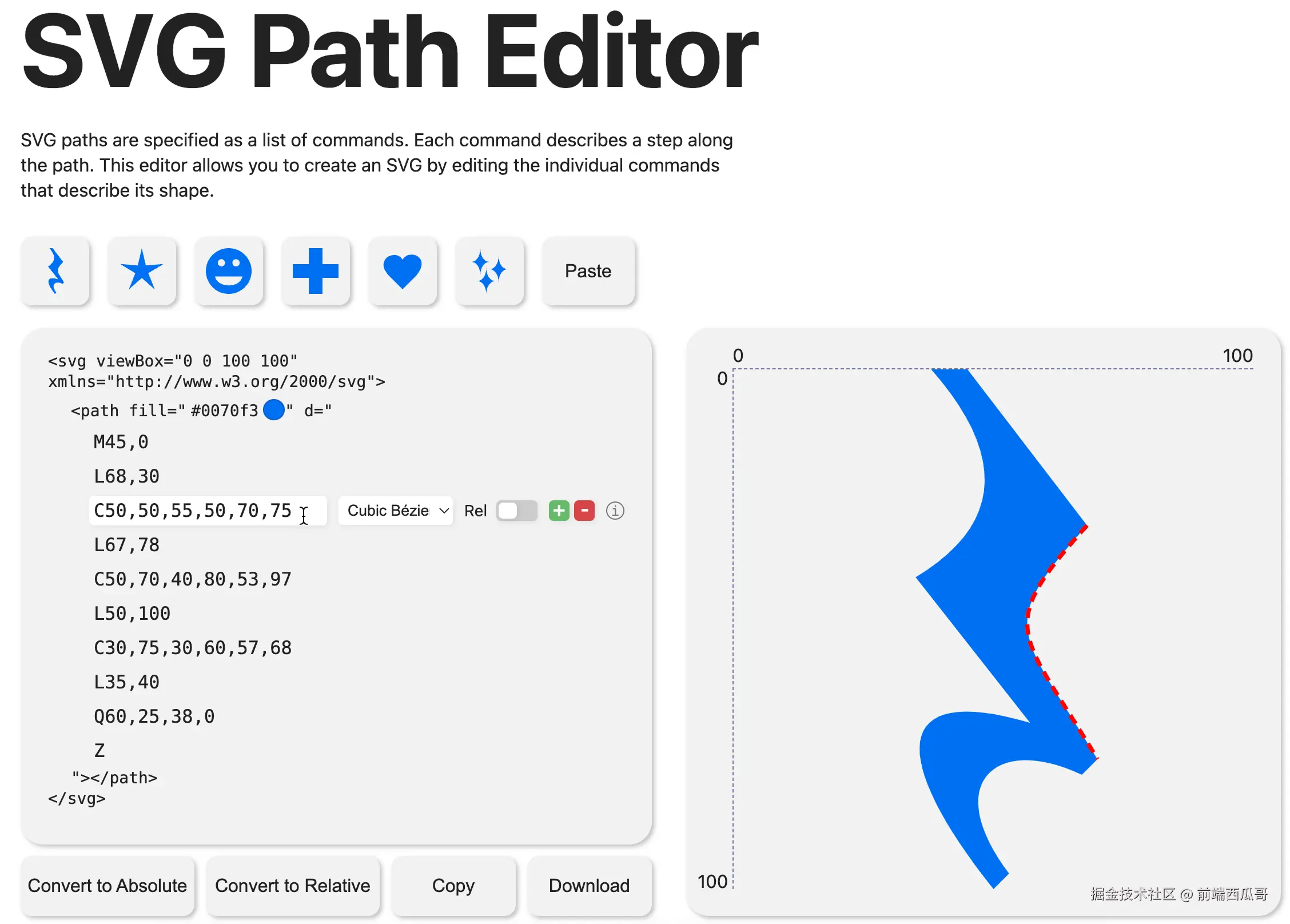 一个针对 SVG 的 Path 元素的查看器,支持通过输入框对路径进行简单编辑。