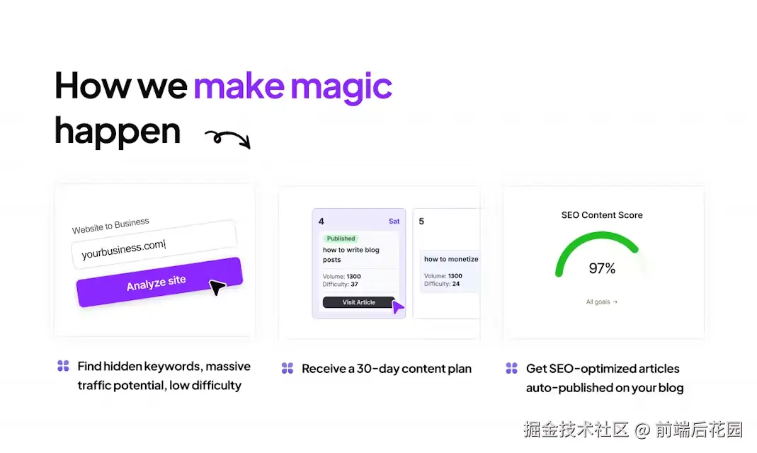 - 介绍:自动提升博客流量:发现未被开发的关键词,生成搜索引擎优化的文章,并自动发布每日内容以获得排名。它就像一个全天候工作的完整内容团队——却没有高昂的成本。