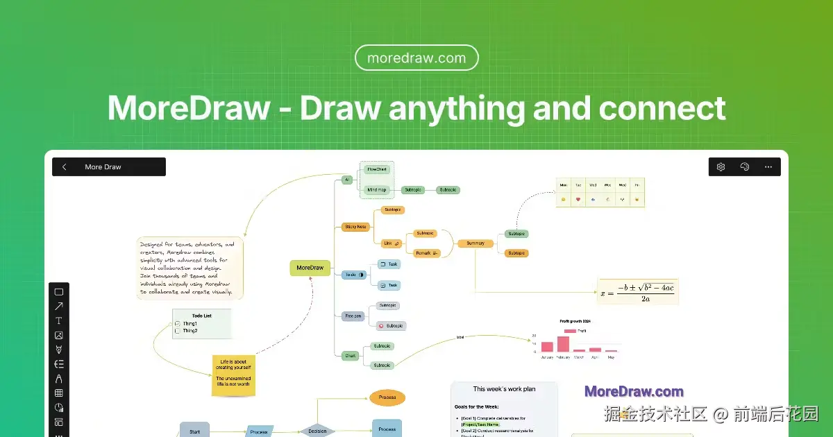 - 介绍:MoreDraw 是一款带有无限画布和内置多种类型节点的思维记录白板,包括流程图、思维导图、图片、笔记、视频、待办事项列表、图表等。任何节点都可以相互链接,帮助你组织思路。