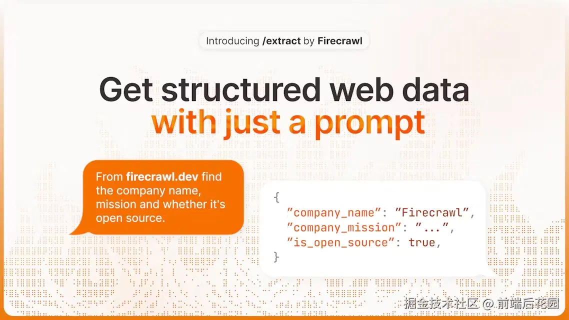 - 介绍:Firecrawl 的 /extract 接口允许你只需一个提示即可获取结构化网络数据——非常适合线索丰富、KYB 自动化或无代码工作流。写一个提示,获取干净的 JSON 数据,几秒钟内提取网络数据,无需任何麻烦。现已开放公测!