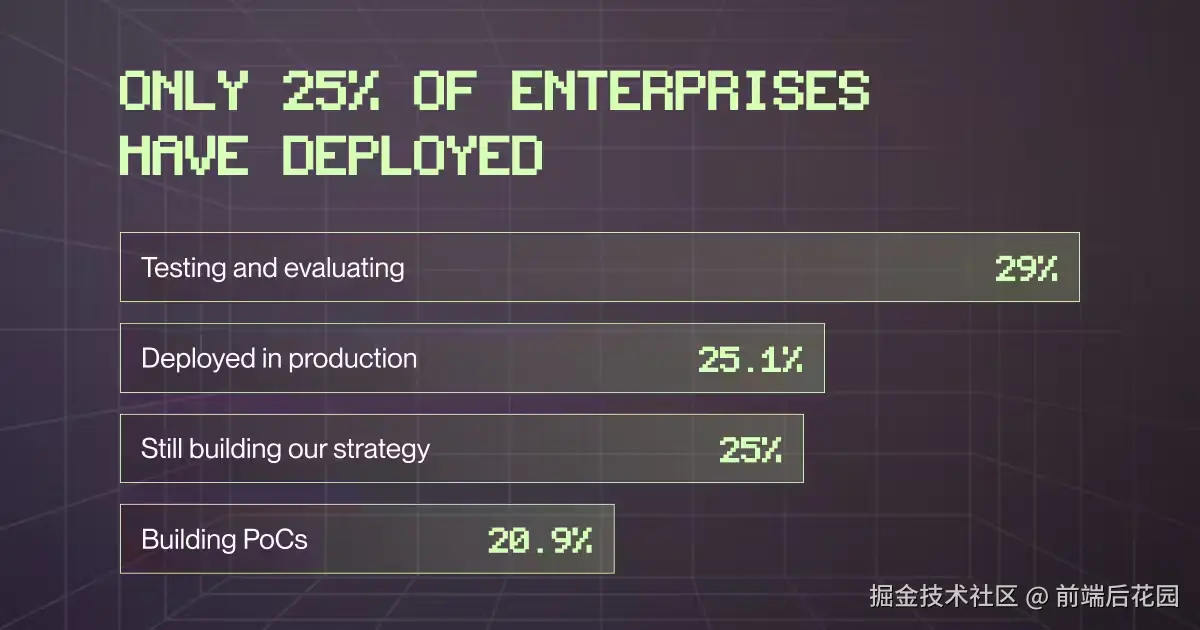 - 介绍:我们调查了 1250 多名 AI 开发者和专家,了解 AI 的使用情况:💻 25% 的企业已将 AI 投入生产,许多仍处于早期阶段。📃 文档解析是最受欢迎的用例 🤖 2025 年,55% 的企业将优先构建智能代理,还有更多👇🏻
