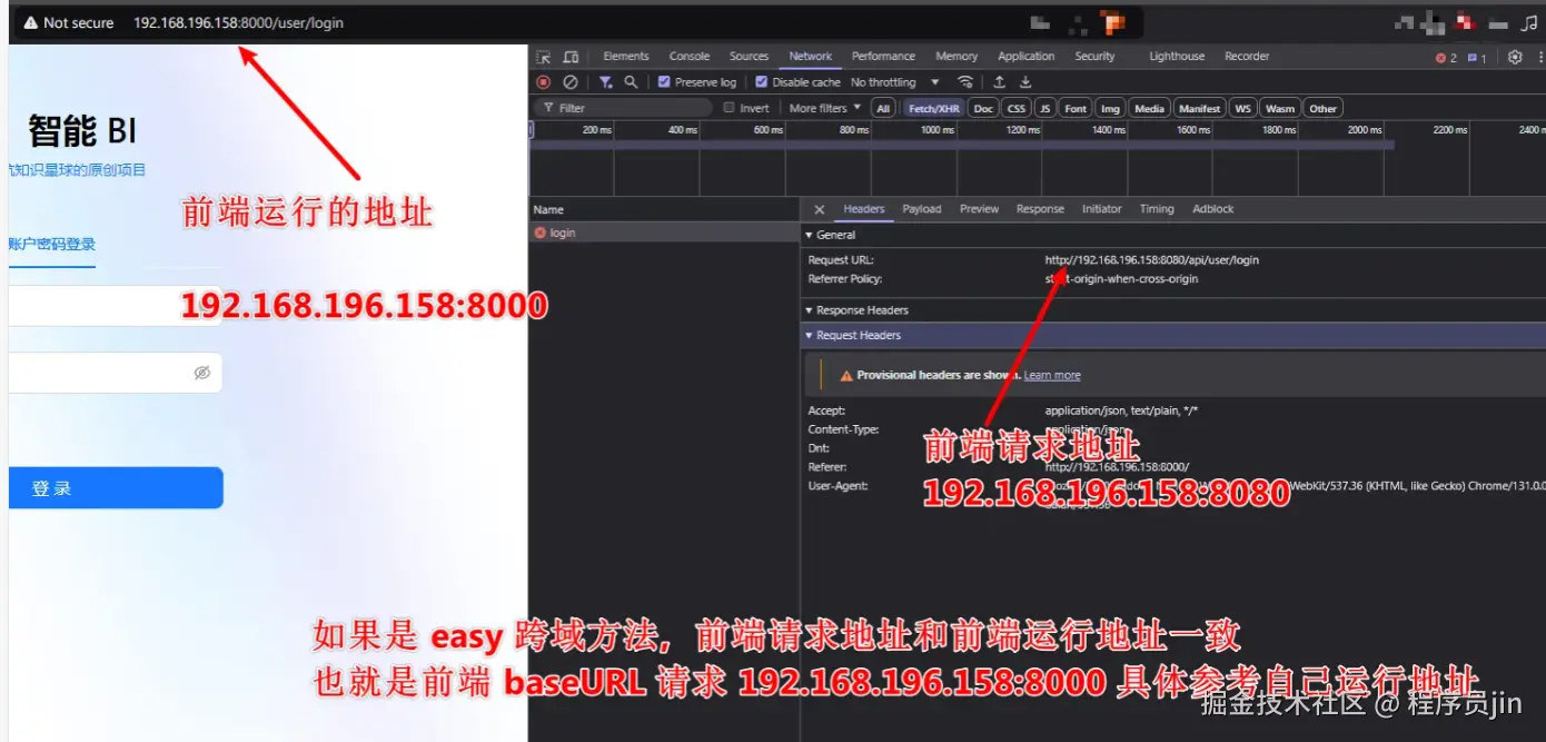 前端请求地址和前端运行地址一致 也就是前端 baseURL 请求 192.168.196.158:8000 具体参考自己运行地址。