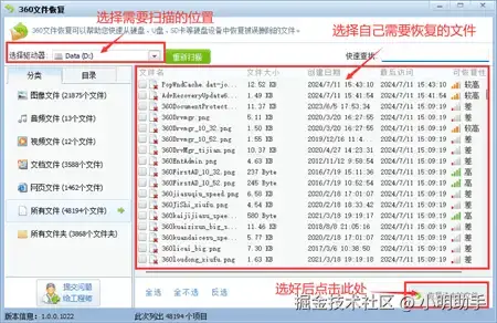 步骤2: 在页面左上角选择需要扫描位置,点击“开始扫描”;扫描结束后,在指定的位置上选择自己需要恢复的文件(建议全选),最后点击“恢复选中的文件”。