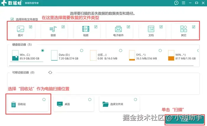 步骤1: 打开数据 蛙恢复专家,在软件的首页上选择需要恢复的文件类型和选择“回收站”,最后点击右下角的按钮;