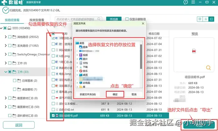 步骤2: 等待软件扫描结束后,选择需要恢复的文件后,点击“导出”;最后再为恢复的文件选择合适的存放位置。