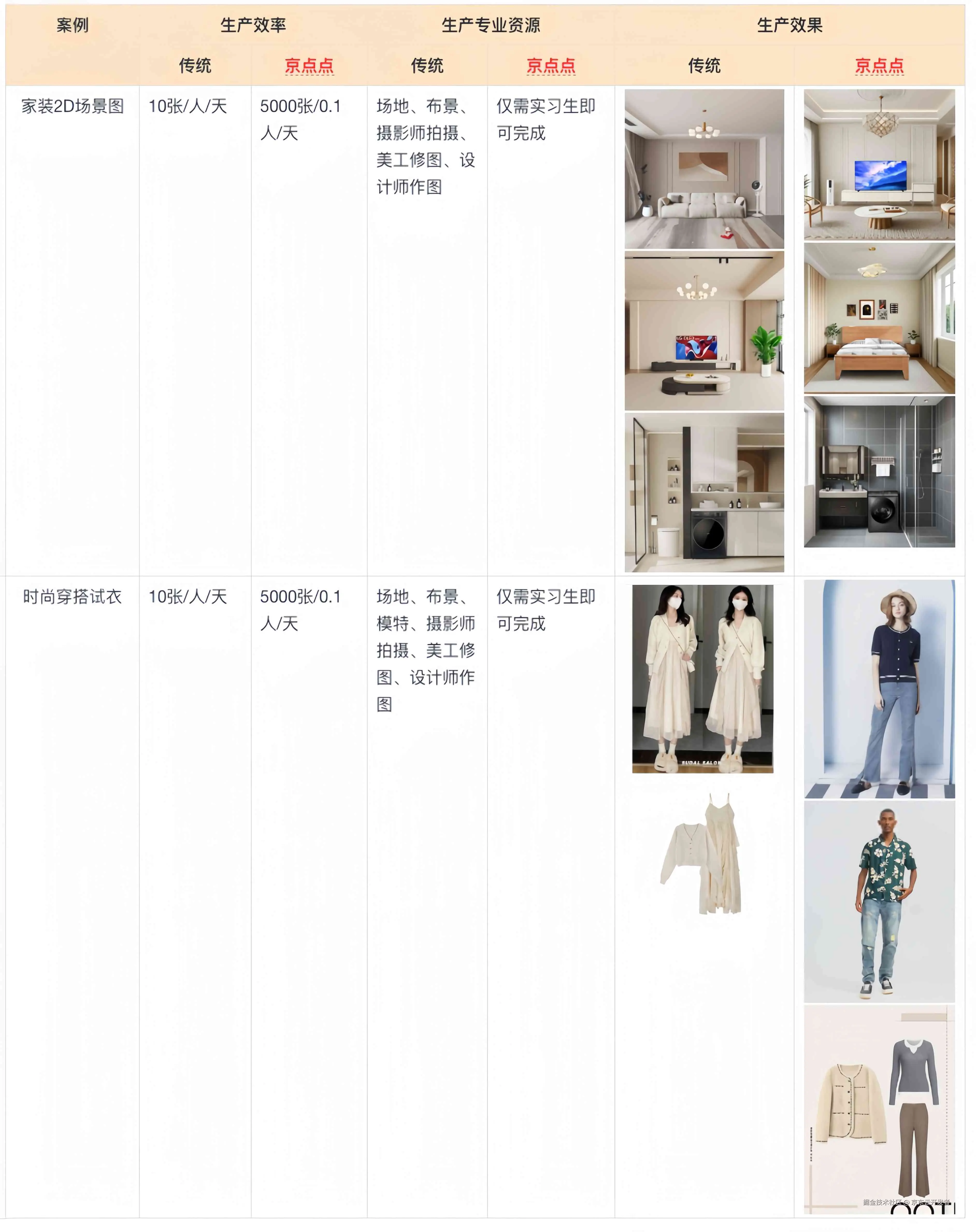 在图片生产人力与时间、生产成本、生产效果等方面,“京点点”AI生图相较传统人工生产有显著优势。如在家装 2D 场景图场景和时尚穿搭试衣场景中: