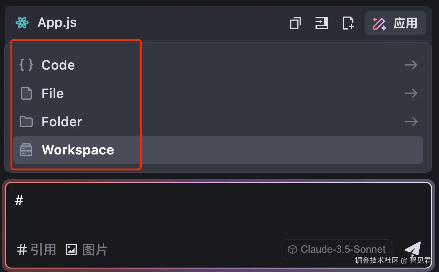Chat 模式支持 4 种引用:代码、文件、文件夹、工作区