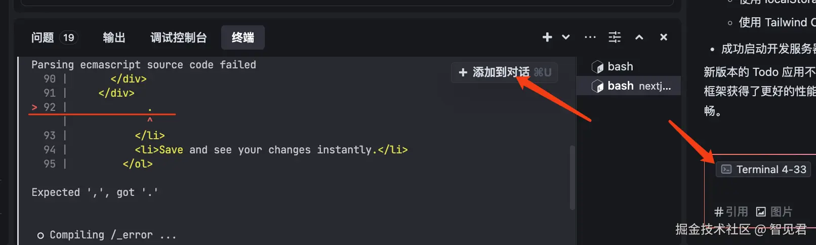 终端报错信息,支持一键添加到对话框,免去了复制/粘贴。