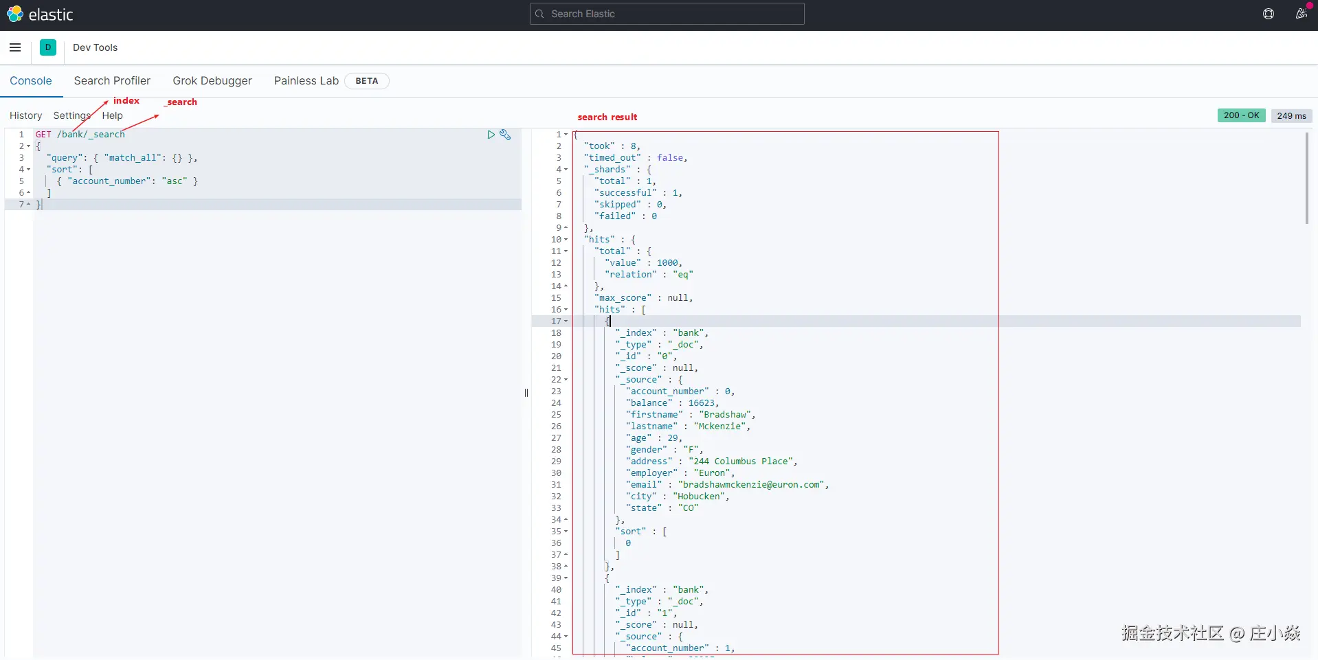 数据是index为bank,accounts.json 下载地址:📎accounts.rar (如果你无法下载,也可以clone ES的官方仓库,然后进入/docs/src/test/resources/accounts.json目录获取)