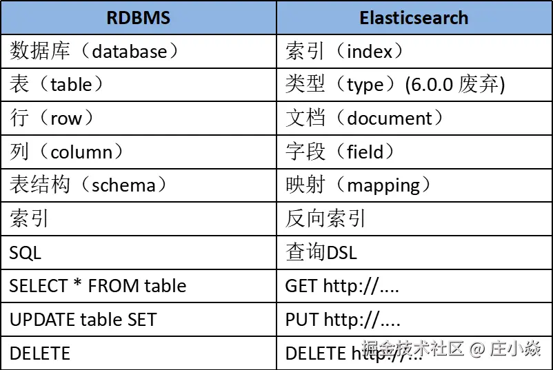 - Type 类型:指在一个索引中,可以索引不同类型的文档,如用户数据、博客数据。从6.0.0 版本起已废弃,一个索引中只存放一类数据。