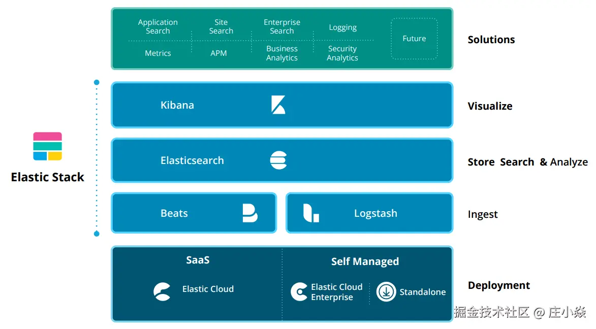 如下是我从官方博客中找到图,这张图展示了ELK生态以及基于ELK的场景(最上方)。