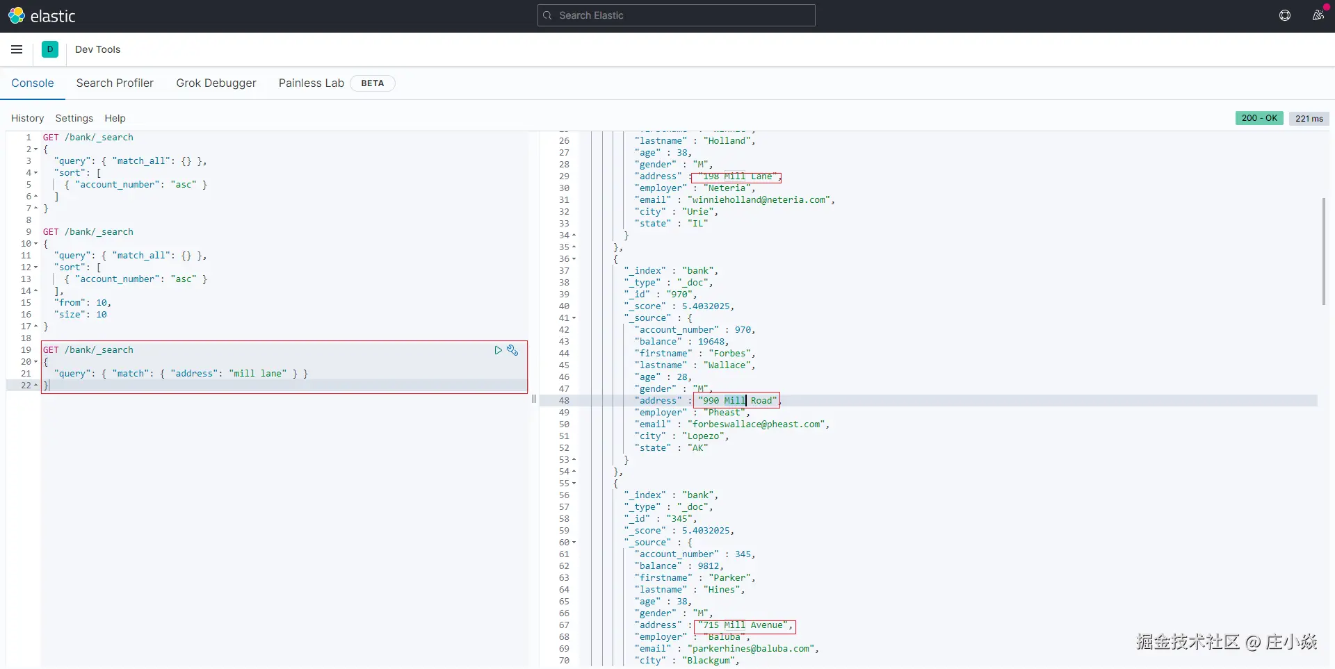 如果要在字段中搜索特定字词,可以使用match; 如下语句将查询address 字段中包含 mill 或者 lane的数据