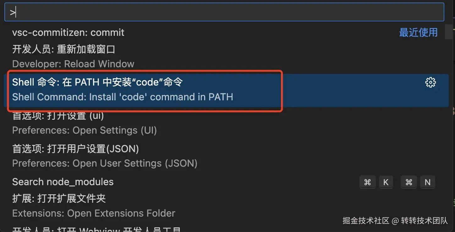 解决:cmd+shfit+p 选择 shell 命令: 在 path 中安装 code 命令。