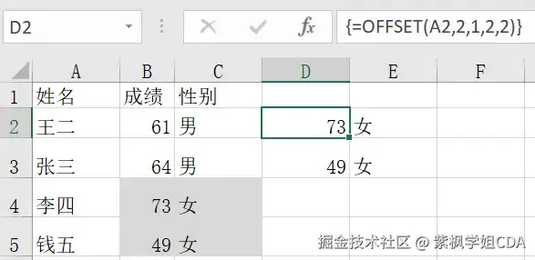 =OFFSET(参照单元格,行偏移量,列偏移量,返回几行,返回几列)