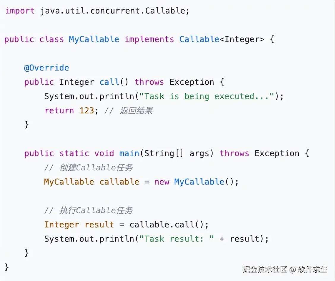 在这个例子中,MyCallable 实现了 Callable 接口,并重写了 call() 方法,返回了一个整数 123。我们通过直接调用 call() 方法来执行任务,并获得返回结果。