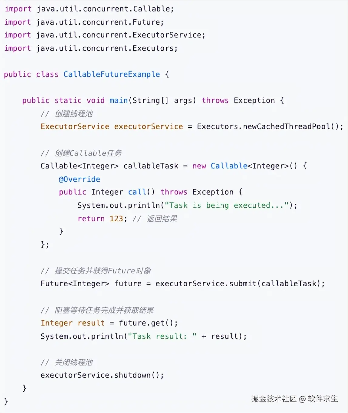 在这个例子中,我们通过 ExecutorService 提交了一个 Callable 任务,并获得了一个 Future 对象。接着,我们调用 future.get() 来阻塞当前线程,直到任务执行完成并返回结果。结果是 123,这就是通过 Future 获取到的。