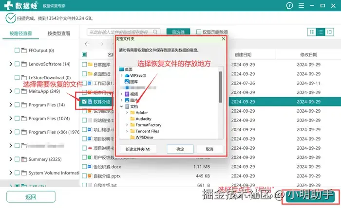 步骤2: 在选好需要恢复的文件后,直接点击右下角的“导出”按钮;在点击完后,需要再选择恢复文件的存放位置。