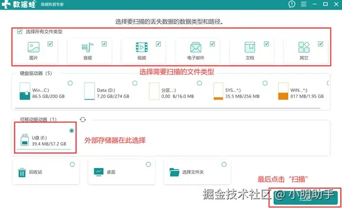 步骤1: 让内存卡连接到电脑后打开数据 蛙恢复专家,然后选择将要进行恢复的数据类型,再选择需要扫描的读卡器,点击“扫描”;