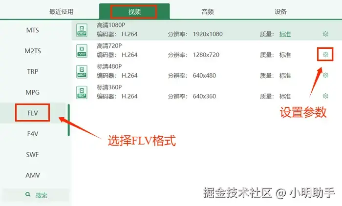 第三步:点击此界面的【视频】按钮,拖动鼠标滑轮找到并选择FLV格式。如果有需要的话,可以点击界面右侧的齿轮按钮设置相关参数。