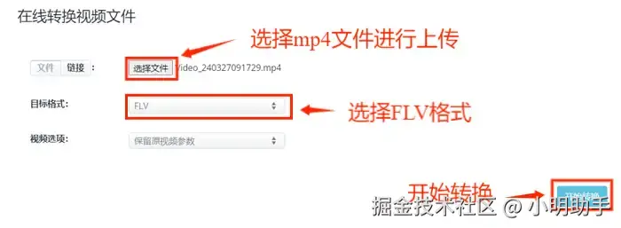 第三步:进入视频转换界面后,点击【选择文件】按钮选择mp4文件进行上传,然后将目标格式设定为FLV格式。完成设置之后,点击【开始转换】按钮开始转换视频格式。