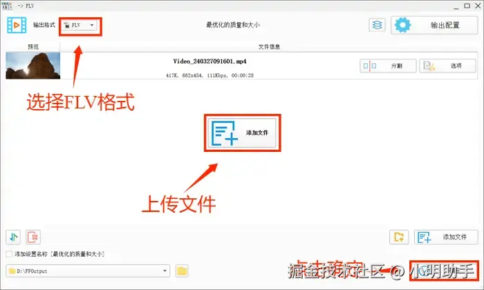 第二步:进入该界面后,点击左上方的输出格式选择按钮选择FLV格式,然后点击【添加文件】按钮上传MP4文件,接着点击【确定】按钮。