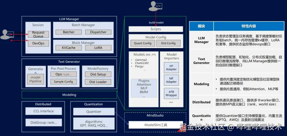 MindIE-LLM框架通过模块化设计,实现了LLM推理的高效管理和部署。该框架包括多个子模块,如LLM Manager、Text Generator、Modeling等,它们分别负责不同的推理任务管理和计算优化工作。下图展示了MindIE-LLM的整体架构和各模块功能(见图11)。