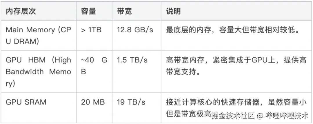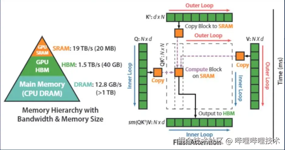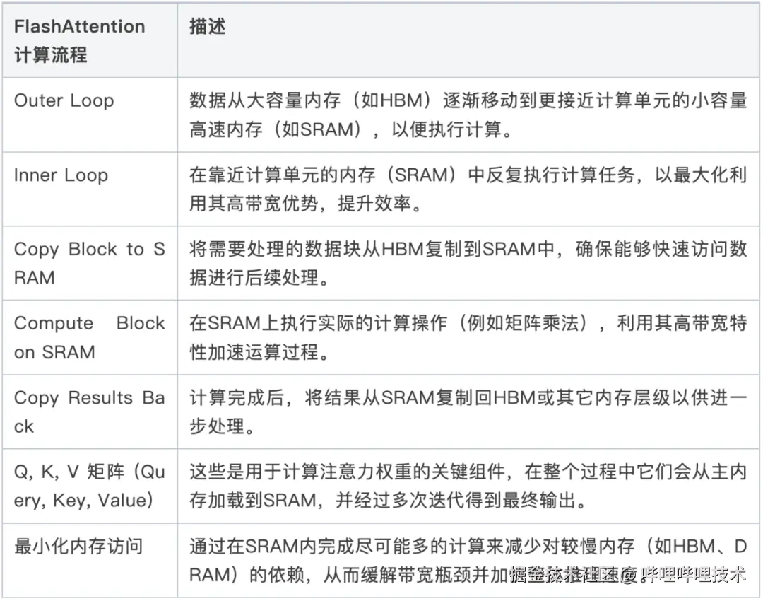 例如FlashAttention通过在计算过程中优化内存带宽利用,将数据块从HBM(高带宽内存)复制到SRAM中,减少了计算过程中的内存访问延迟,并在SRAM中进行尽可能多的计算,以提高整体带宽利用率和计算效率。这种方法有效地减少了传统Attention机制中由于大量内存访问而产生的性能瓶颈。如图(5)所示, FlashAttention的计算和数据传输过程,下表逐步解释它的计算和数据传输过程。