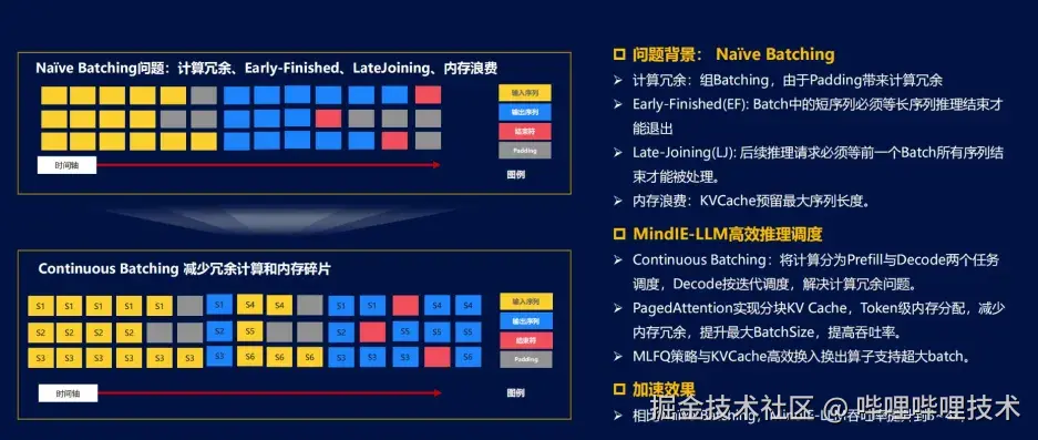 在推理过程中,传统的Naive Batching会导致计算冗余和内存浪费,MindIE-LLM通过引入Continuous Batching减少了这些问题。Continuous Batching将推理任务按Prefill和Decode两个任务调度,以减少不必要的等待时间和内存开销。实验数据显示,使用Continuous Batching可以将吞吐量提升至3到4倍,相比传统方法有显著优势(见图13)。