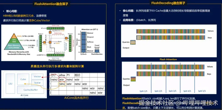 MindIE-LLM框架中使用了FlashAttention和FlashDecoding技术,用于在推理阶段加速计算。FlashAttention通过批量处理和优化内存带宽利用,显著减少了计算的等待时间,而FlashDecoding则对长序列场景下的解码过程进行了优化。通过对计算流程的并行化,使得即便在batch size较小的情况下也能有效利用计算资源。下图展示了FlashAttention和FlashDecoding的工作原理(见图12)。
