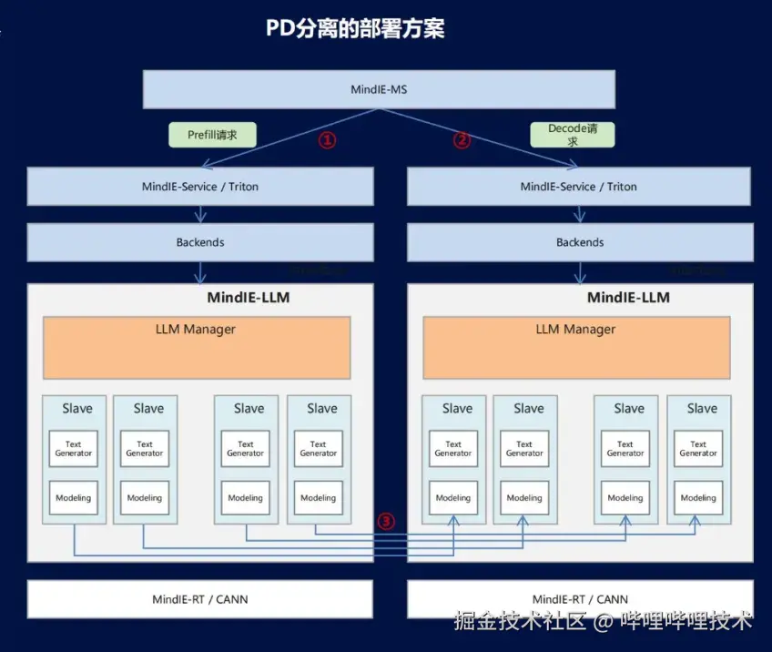 在MindIE-LLM框架中,推理任务被划分为Prefill和Decode两个阶段,并通过PD分离的方式在不同物理设备上并行执行。这种优化策略有效地减少了阶段之间的依赖性,提高了硬件资源利用率。下图展示了PD分离部署方案的工作原理(见图15)。