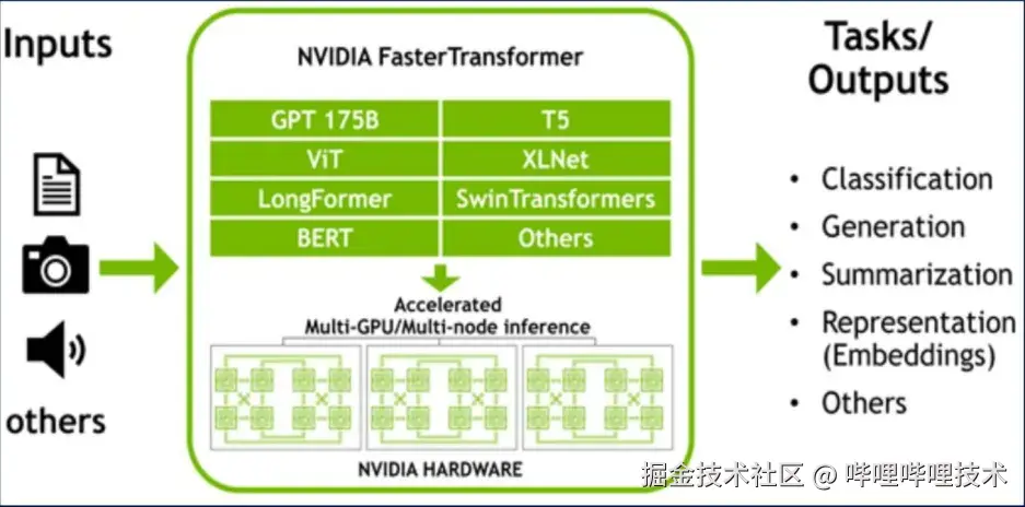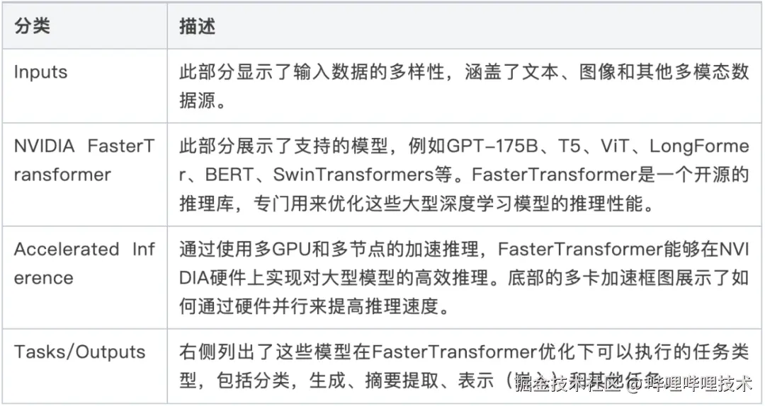 总结来说,FasterTransformer通过多GPU/多节点加速和优化模型架构,显著提高了大规模预训练模型的推理速度和效率。图中描述的这种加速机制特别适用于需要高吞吐量和低延迟的推理任务,例如文本生成、摘要和嵌入表示等。