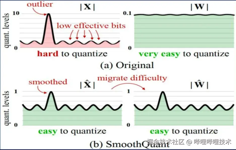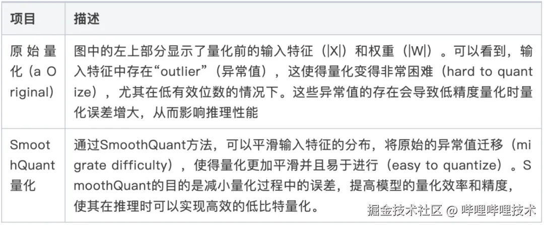 使用精度更低的单位来表示模型的权重或激活值,以节省空间和加速模型推理速度。例如,使用SmoothQuant、AWQ、GPTQ等量化方法,可以实现8Bit甚至更低精度的量化,以降低模型的计算开销[1]。此外,量化可以进一步分为权重量化和权重与激活同时量化,这在推理中可以显著减少内存占用和带宽需求。如图(8)所示,展示了SmoothQuant量化前后的对比,下表详细解释了图中展示的内容。