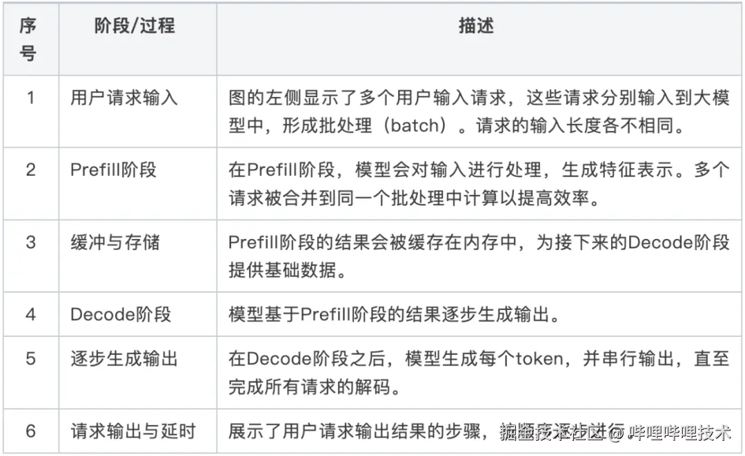 在推理过程中,大模型的推理可以分为Prefill阶段和Decode阶段。如图(3)所示,这幅图描述了大模型推理的流水线过程,主要分为两个阶段:Prefill阶段和Decode阶段。以下是对图中每个部分的解释: