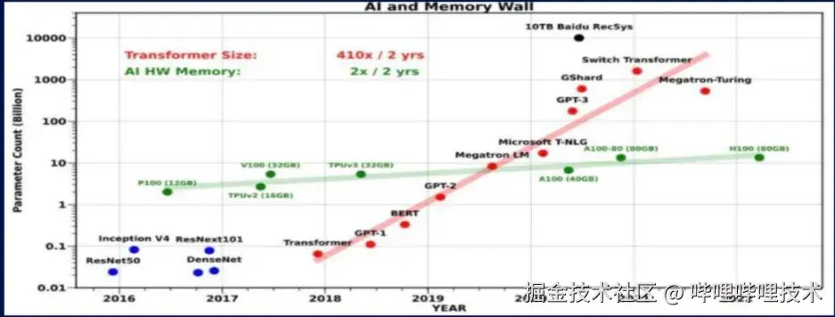 此外,模型参数的增长速度远快于硬件内存容量的提升速度,如图(2)所示,Transformer模型中的参数数量(红色)呈现出2年240倍的超指数增长,而单个GPU内存(绿色)仅以每2年2倍的速度扩大,这进一步加剧了推理中的内存瓶颈问题。