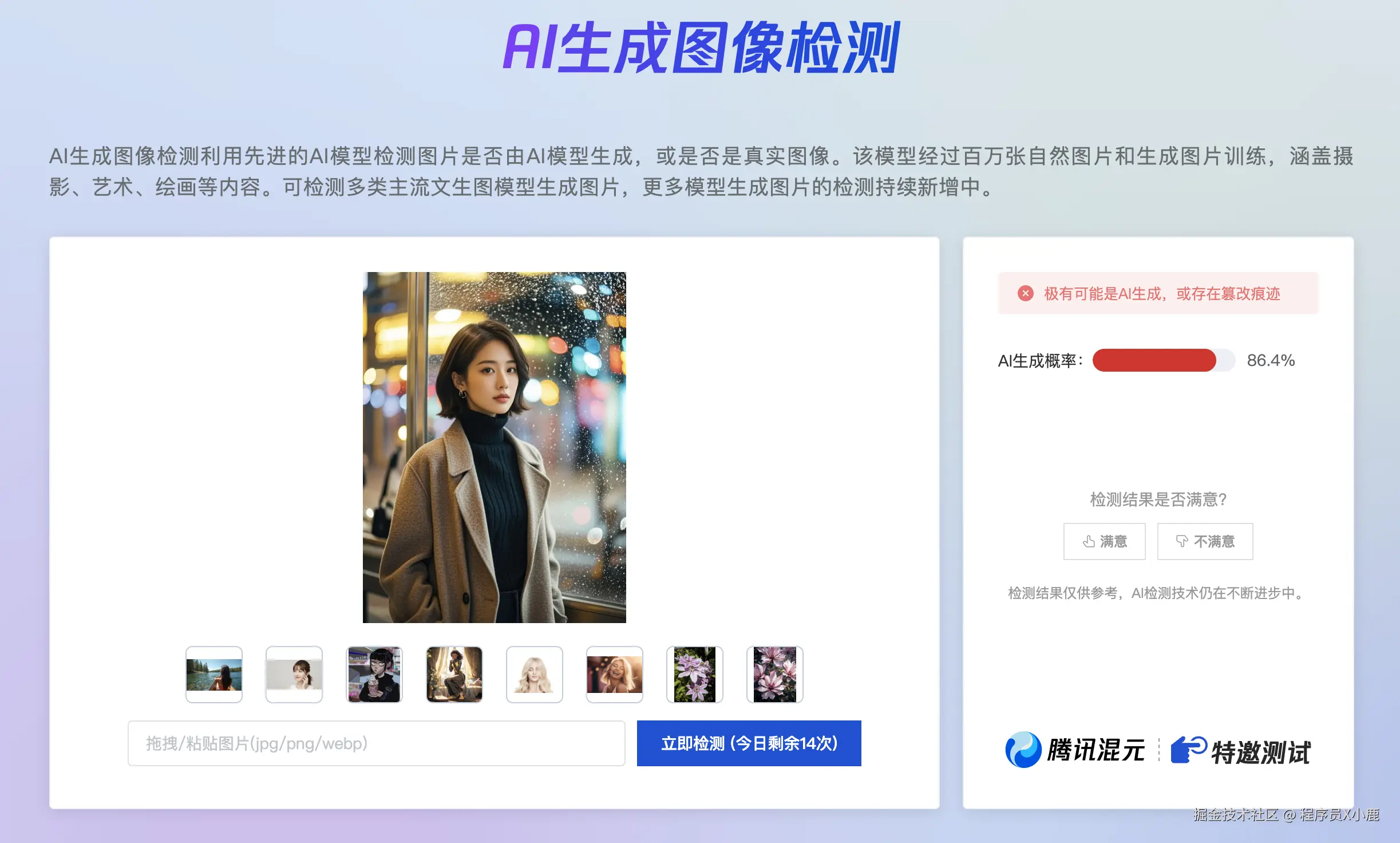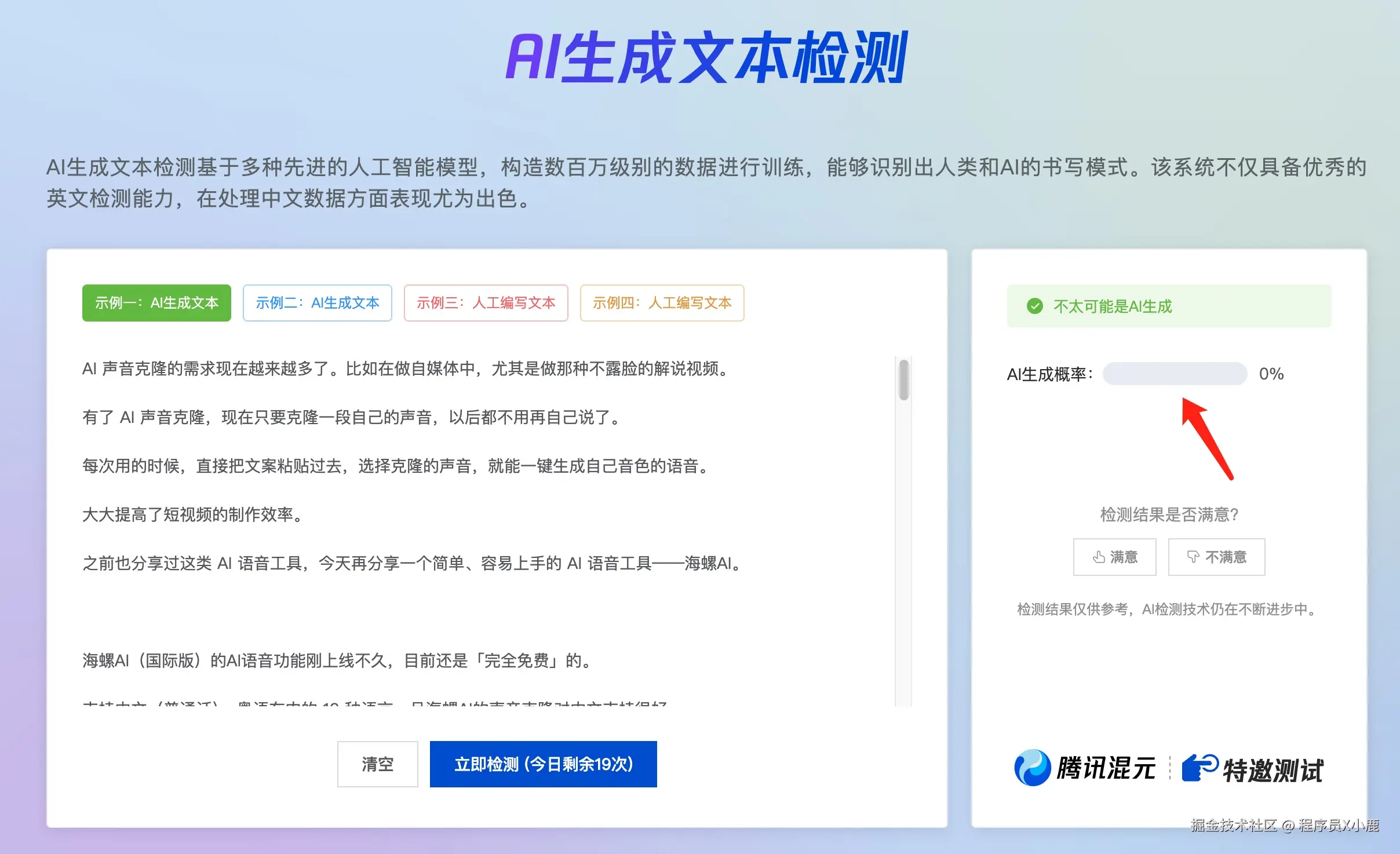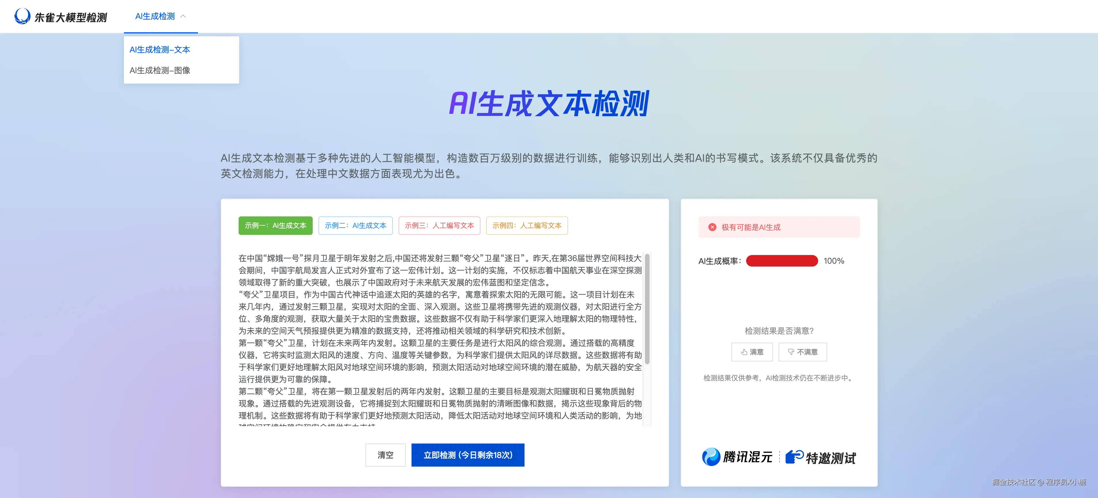 腾讯朱雀实验室研发了一款 AI 鉴别工具,可以识别文本以及图片是否是 AI 生成的。