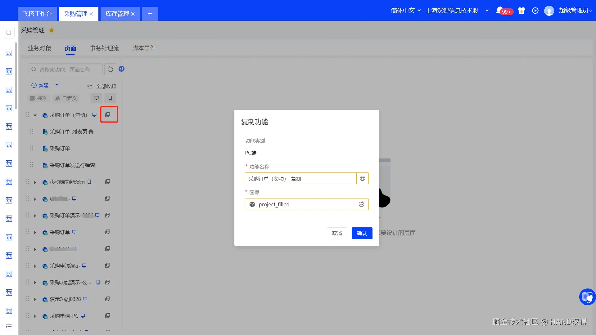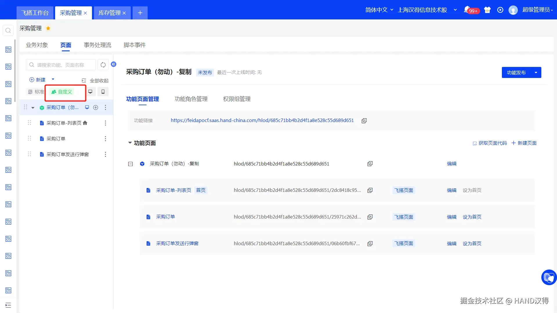 比如子公司租户可以将平台的标准采购管理功能复制为当前租户的自定义功能,与自己的库存系统进行集成。
