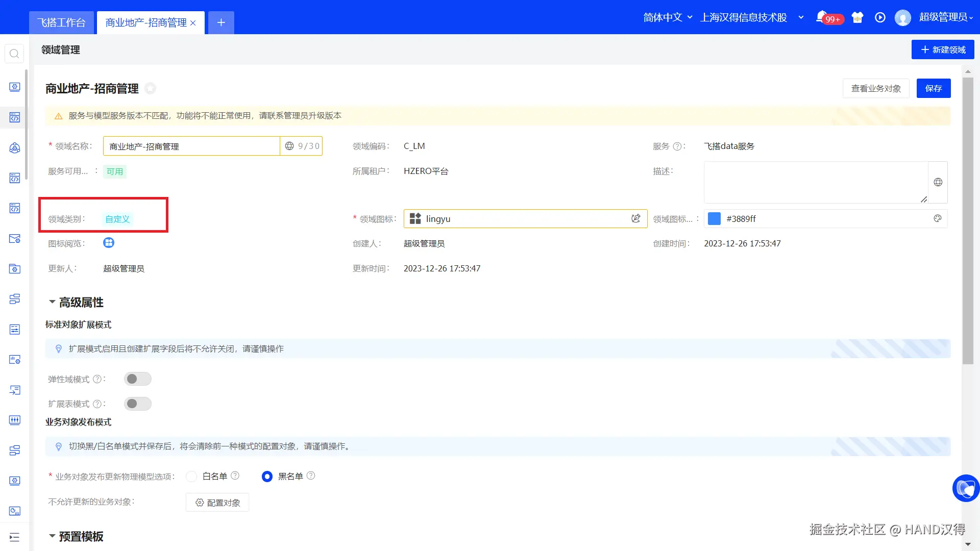 如租户希望独立开发属于自己的系统或功能,飞搭也新增支持创建租户自定义领域,在租户领域下创建业务对象、页面等数据,且不允许在平台层直接编辑租户自定义领域内的数据,保证租户自定义功能的自主性。