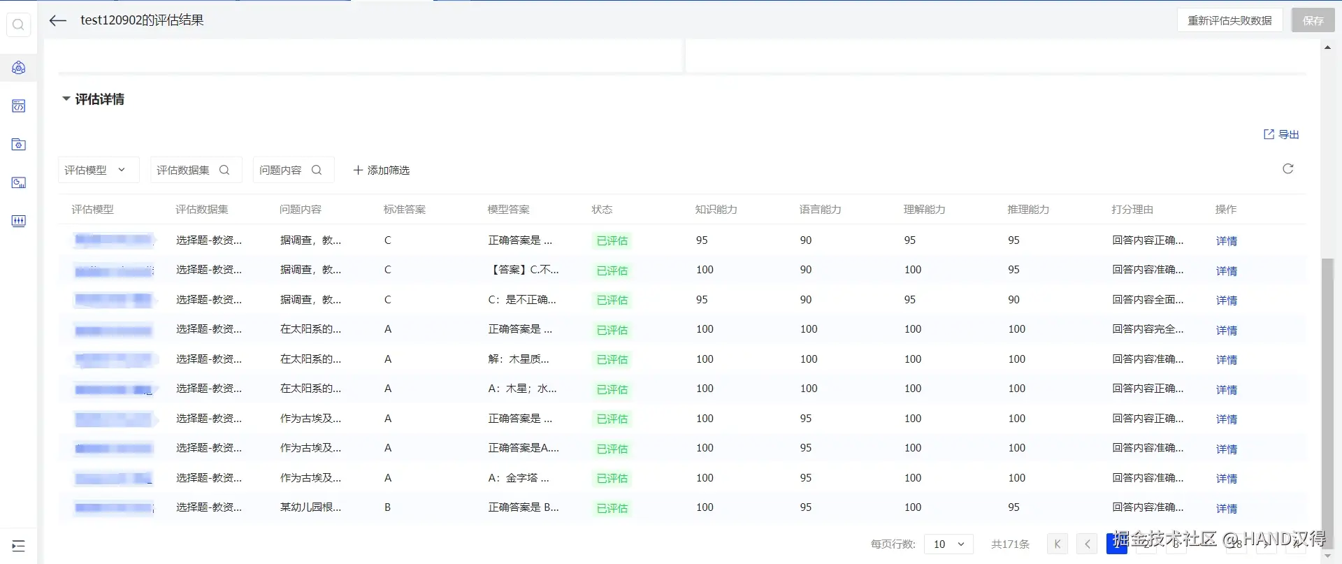 除此之外,汉得AIGC平台还提供了详细的评估详情。包括被评估对象针对每个问题的具体答案内容,以及这些答案在评估维度上所获的具体得分,让用户能够深入了解模型的每一个细节表现。