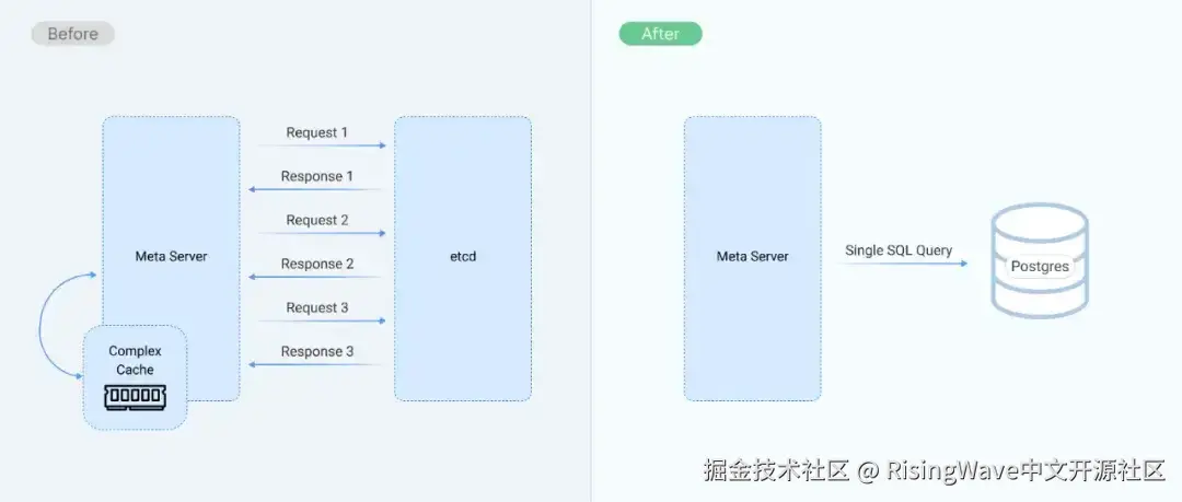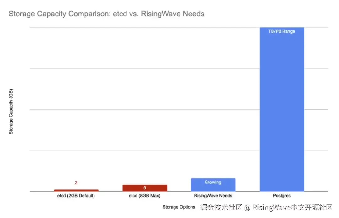 RisingWave 是一款开源的分布式 SQL 数据库,专为流处理而设计,因其简化实时分析的强大能力而备受关注。然而,随着我们的用户开始构建更大、更复杂的应用程序,意外发现元数据存储 etcd 成为了性能瓶颈。在这篇文章中,我们将分享为什么决定用 Postgres 作为后台的元存储替换 etcd,其中面临的挑战,以及这种看似“老派”的方法如何为 RisingWave 解锁了新的可扩展性和开发者生产力。