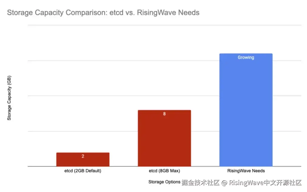 etcd 的架构基于单个 Raft 组,没有 Sharding,这严重影响了其可扩展性。默认存储限制为 2 GB,推荐的最大值为 8 GB。这对我们来说是一个显著制约,因为 RisingWave 集群中的元数据量迅速增长。在某些情况下,磁盘空间不足时,我们甚至经历了部分提交事务导致的数据损坏。使用 Protobuf 编码处理元数据也使得调试和故障排查变得复杂。