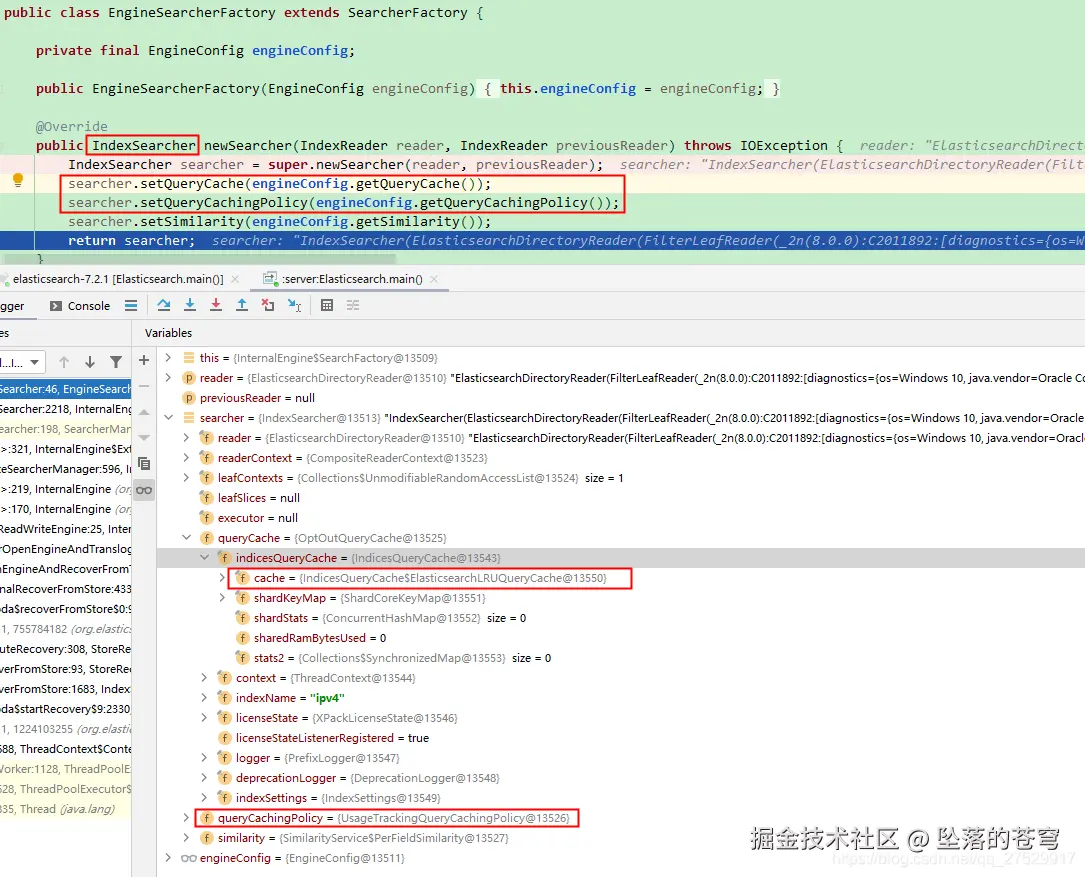 Elasticsearch在构建Lucene的IndexSearcher时,指定了 QueryCache 和 QueryCachingPolicy,QueryCache使用了装饰模式,OptOutQueryCache 是Security相关的操作,IndicesQueryCache 就是上面代码实例化的,内部持有 ElasticsearchLRUQueryCache 。