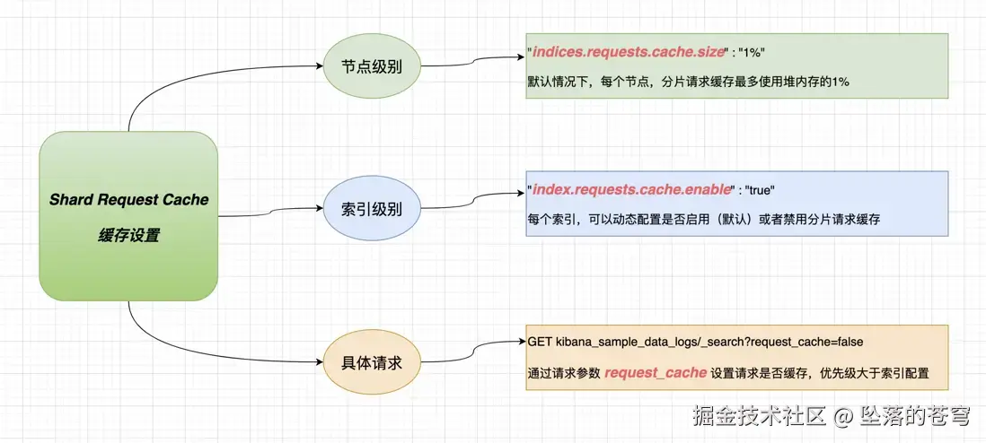 ShardRequestCache是ES层级的实现,缓存机制为LRU, 访问一次,就会考虑缓存,主要用途是对聚合结果进行缓存NodeQueryCache是Lucene层级的实现,缓存机制为LRU, 访问达到一定频率,才会考虑缓存,主要用途是对filter子查询的缓存