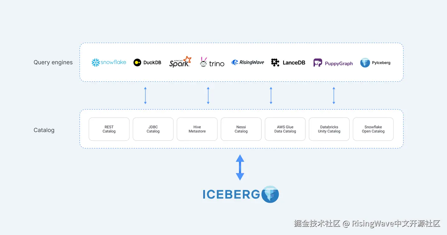 不同的数据处理工具(engines)擅长不同的任务。Iceberg 支持多引擎,用户可以根据任务类型选择最合适的工具。例如,将 Iceberg 与 Snowflake 配对以处理复杂的分析查询(OLAP),与 DuckDB 配对进行轻量级分析。这类组合既节省成本,又不影响灵活性。其他查询引擎,如 Trino(用于联邦查询)、RisingWave(用于流处理)、LanceDB(用于向量搜索)、PuppyGraph(用于图形分析)等,提供了多场景下的低延迟查询能力,进一步丰富和提升了 Iceberg 生态系统。此外,借助多引擎兼容,企业将不再局限于单一技术,可以实现从交互式仪表板到实时流分析的多种高级功能。