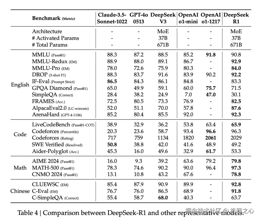 在技术层面,R1 在后训练阶段大规模使用了强化学习(RL)技术,在仅用非常少标注数据的情况下,极大提升了模型推理能力。下图为 R1 与 o1-1217、o1-mini、自家 DeepSeek-V3 在多个数据集上的性能比较,可以看到,R1 与 o1-1217 不相上下、互有胜负。
