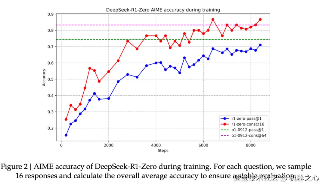随着训练的深入,模型也发展出了一些高级行为,比如反思能力和探索不同解题方法的能力。这些都不是预先设定的,而是模型在强化学习环境中自然产生的。
